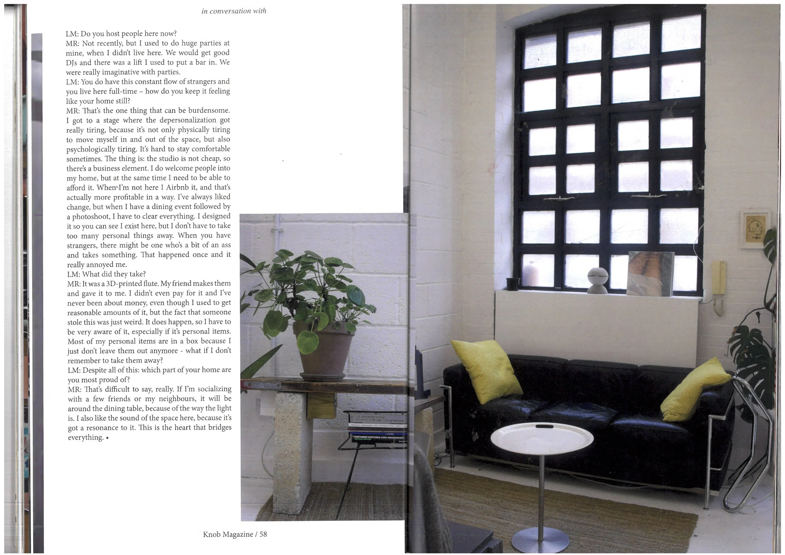 Martyn: That’s the one thing that can be quite burdensome. I got to a stage, where the depersonalization got really tiring, because it’s not only physically tiring to move myself in and out of the space, but also psychologically tiring. It’s hard to stay comfortable sometimes. The thing is, the studio is not cheap, so there's a business element. I do welcome people into my home, but at the same time I need to for me to be able to afford it. When I’m not here I Airbnb it, and that’s actually more profitable in a way. I’ve always liked change, but I think it’s when I’ve got a dining event and then two days later a photoshoot and I have to clear everything. I designed it so you can see I exist here, but I don’t have to take too many personal things away. When you have strangers, there might be one, who’s a bit of an ass and takes something. That happened once and it really annoyed me.